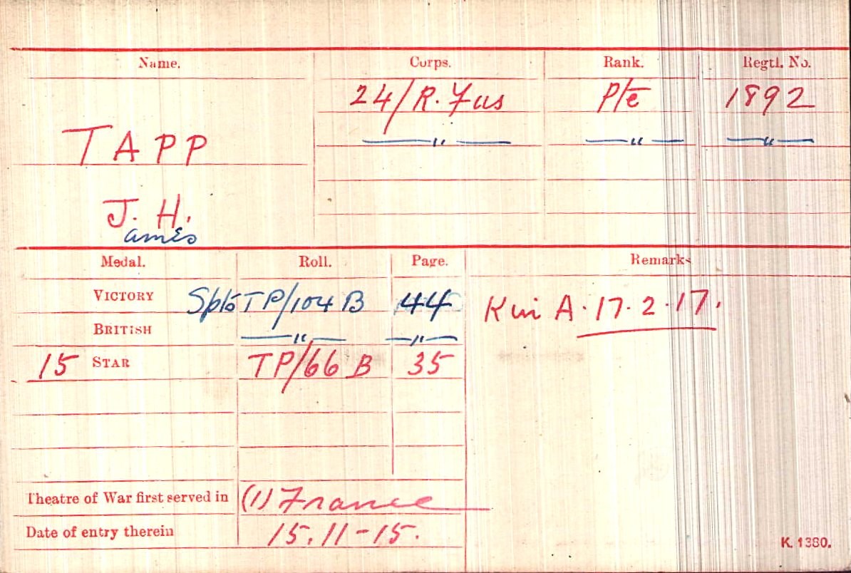 Sapper James Phillips 58904. Unit: 106th Field Company, Royal Engineers. Death: 17 February 1917 Missing Western Front