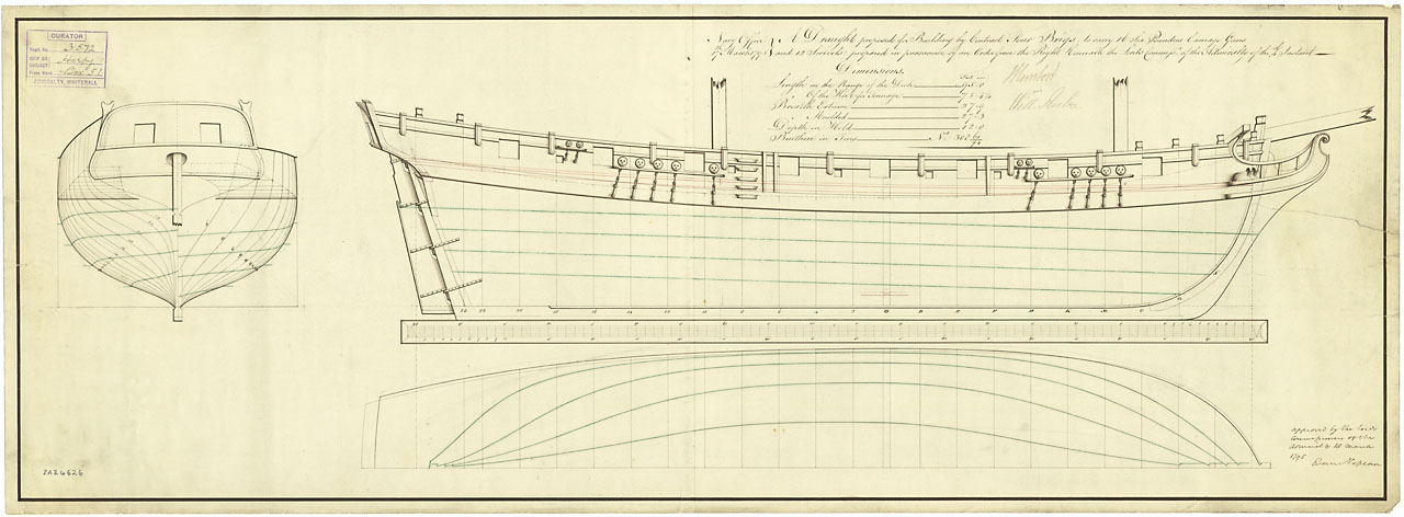 Diligence (1795); Harpy (1796); Hound (1796); Seagull (1795); Racoon (1795); Kangaroo (1795); Camelion/Cameleon (1795); Curlew (1795). Scale: 1:48. Plan showing the body plan with stern board outline, sheer lines with scroll figurehead, and longitudinal h