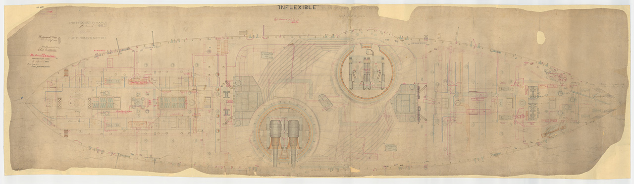 HMS Inflexible (1876). Scale 1:48. A plan showing the main deck of the masted turret battleship HMS Inflexible (1876), illustrating her appearance as completed with alterations marked in red ink.