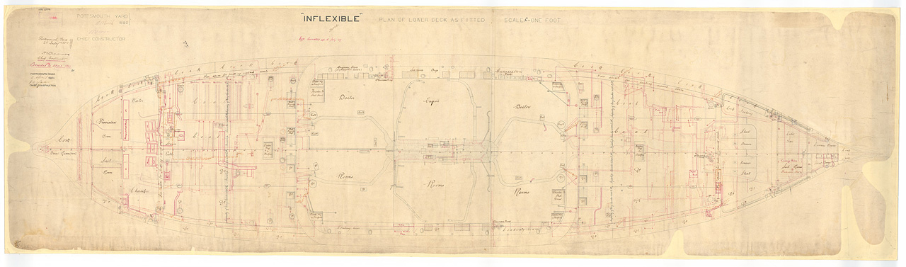 HMS Inflexible (1876). Scale 1:48. A plan showing the lower deck of the masted turret battleship HMS Inflexible (1876), illustrating her appearance as completed with alterations marked in red ink.