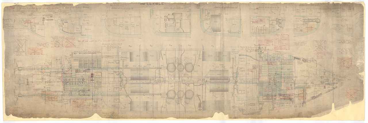 HMS Inflexible (1876). Scale 1:48. A plan showing the hold and sections of the masted turret battleship HMS Inflexible (1876), illustrating her appearance as completed with alterations marked in red ink.