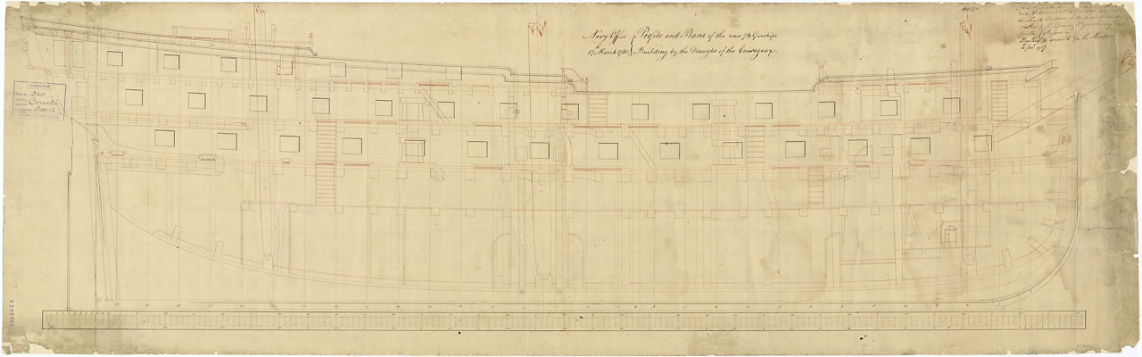 Carnatic (1783); Leviathan (1790); Colossus (1787); Minotaur (1793). Scale: 1:48. Plan showing the inboard profile for the Carnatic (1783), and Leviathan (1790). Later the plan was used for Colossus (1787), and Minotaur (1793), all 74-gun Third Rate, two-