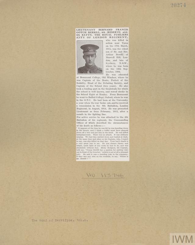 Lieutenant Bernard Francis Gotch Berrill. Unit: 6th Reserve, attached to 4th Battalion, Royal Fusiliers (City of London Regiment). Death: 17 March 1915 Ypres Western Front