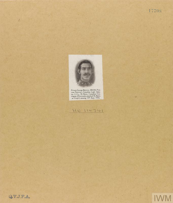 Private George Briggs 446326. Unit: 2nd Company, 58th Battalion, Princess Patricia's Canadian Light Infantry (Eastern Ontario Regiment), Canadian Expeditionary Force. Death: 17 September 1916, missing, Western Front. Commemorated on the Vimy Memorial.