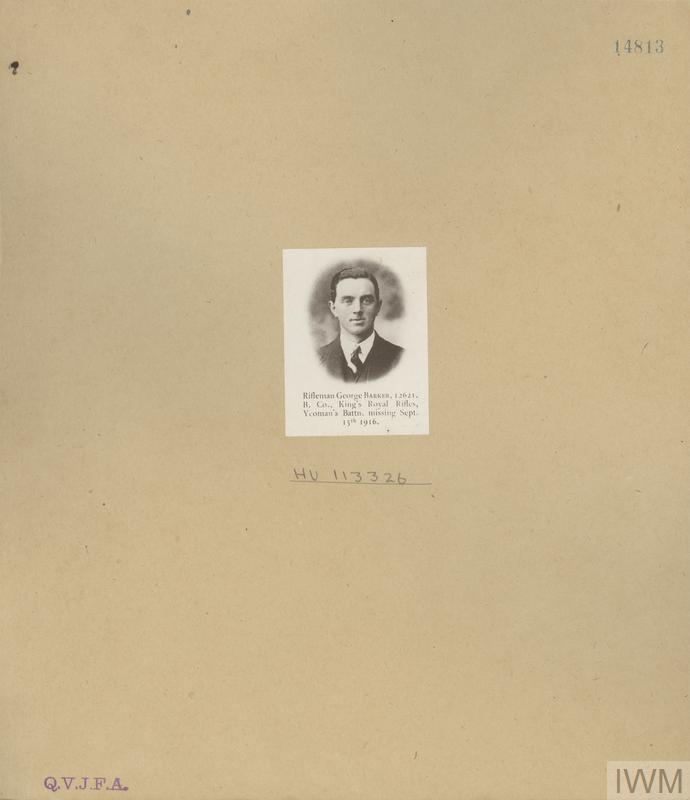 Rifleman George Barker C/12621. Unit: "B" Company, 21st (Yeoman's) Battalion, King's Royal Rifle Corps. Death: 17 September 1916, Somme, Western Front.