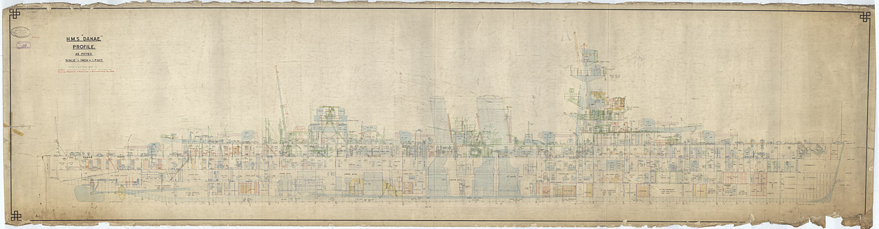 Danae (1918). Scale 1:48. Plan showing the profile for the light cruiser HMS Danae (1918), as fitted in 1918. The plan also includes alterations at Chatham dated February 1925 in green ink, at Malta dated September 1925 in sienna, and at Devonport in Ma