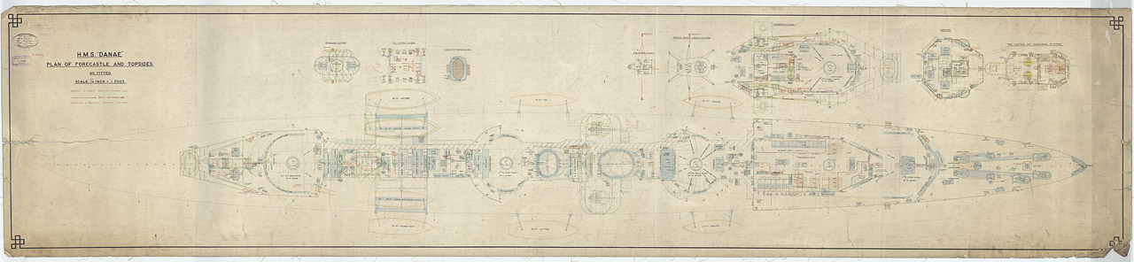 Danae (1918). Scale 1:48. Plan showing the forecastle deck, fire control and manoeuvring platform, bridge, superstructure, director tower, lookout platform, fire control platform (forward), searchlight platform and fire control platform (aft) as fitted f