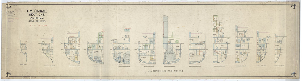 Danae (1918). Scale 1:48. Plan showing the sections as fitted for the light cruiser HMS Danae (1916). The plan shows the starboard side half sections, looking from amidships, frames 21, 37, 55, 65, 85, 103, 127, 137, 161, 175, 204 & A,P. The plan a