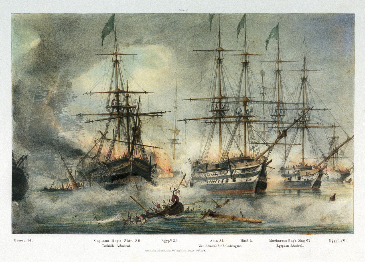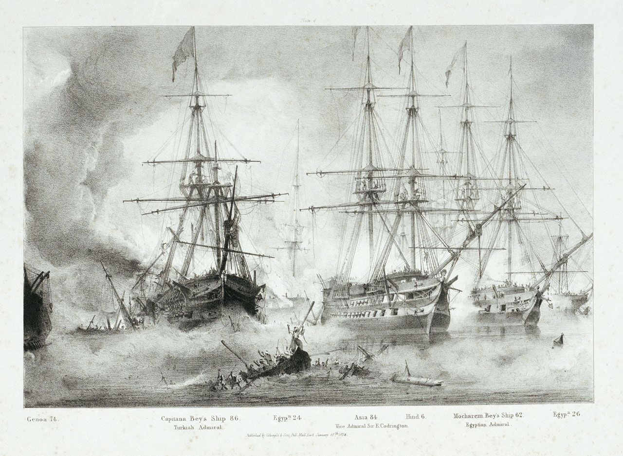 Asia and other vessels at the Battle of Navarino, 20 Oct 1827. Plate no.4.; One of thirteen plates (plate no.1 missing), others are PAF4810-PAF4811, PAF4813-PAF4821.