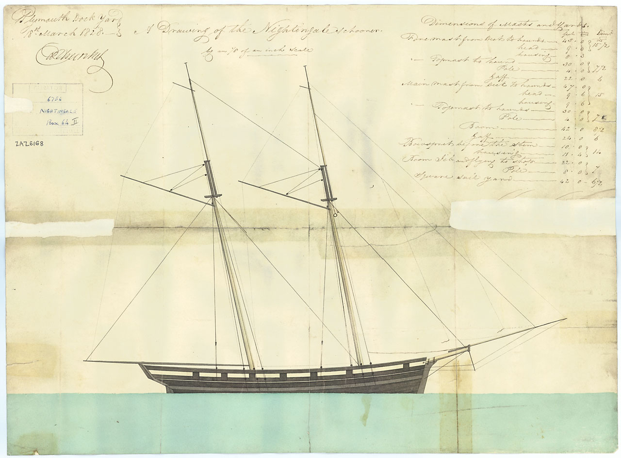 Nightingale (1825). Scale: 1:96.  A plan showing the rig and the sail profile for Nightingale (1825), a 2-gun Schooner.