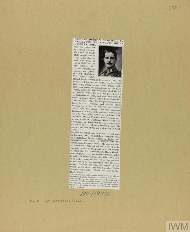 Captain Duncan Campbell. Unit: 2nd Battalion, Black Watch (Royal Highlanders). Death: 18 May 1915 Killed in action France Western Front