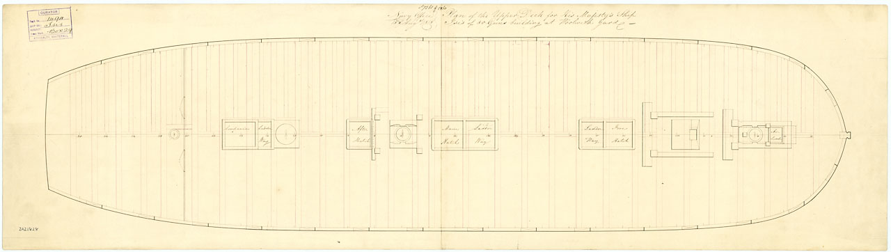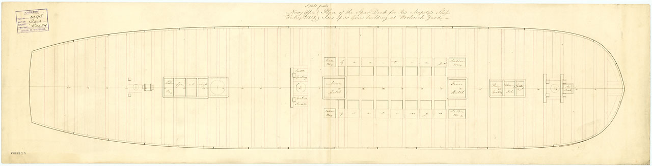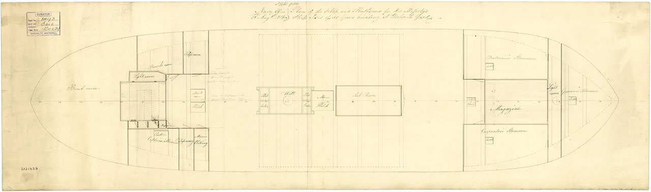 Isis (1819). Scale: 1:48. Plan showing the orlop deck with fore & aft platforms for Isis (1819), a 50-gun (later 58-gun) Large Fourth Rate Frigate, building at Woolwich Dockyard.