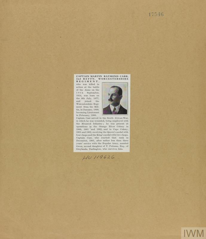 Captain Martin Raymond Carr. Unit: 2nd Battalion, Worcestershire Regiment. Death: 18 September 1914 Killed in action at the Ainse Western Front