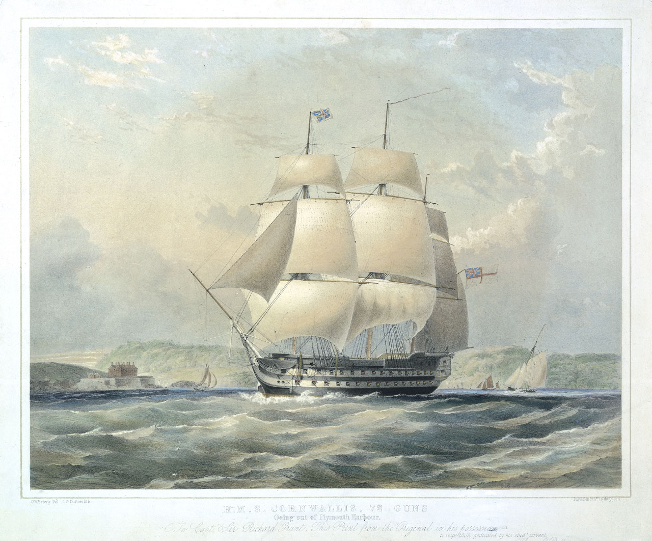 H.M.S. Cornwallis 72 Guns Going out of Plymouth Harbour. Hand-coloured.