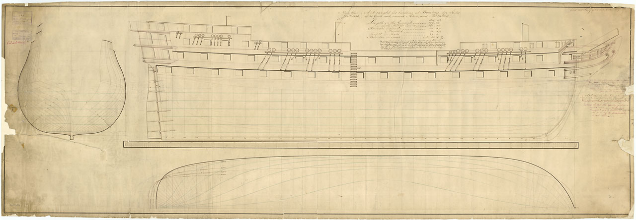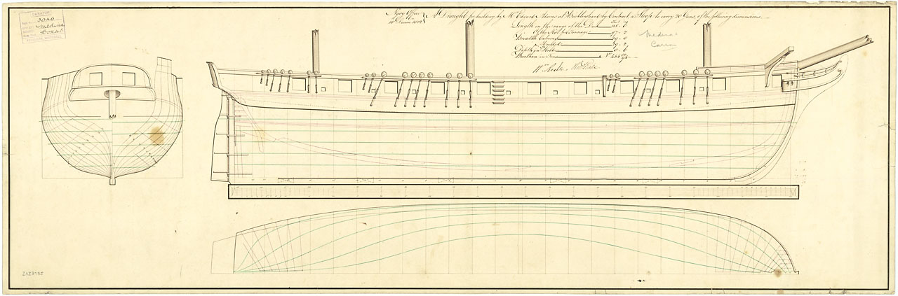 Medina (1813); Carron (1813). Scale: 1:48. Plan showing the body plan with stern board outline, sheer lines, and longitudinal half-breadth for building Medina (1813) and Carron (1813), both 20-gun Sixth Rate Sloops at Bucklers Hard by Edward Adams.