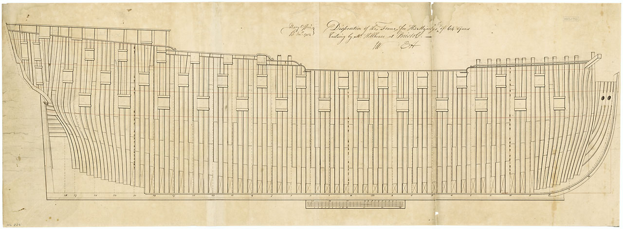 'Nassau' (1785). Scale: 1:48. A plan showing the framing plan (disposition) for 'Nassau' (1785), a 64-gun Third Rate, two-decker, building at Bristol by Mr James Martin Hilhouse.
