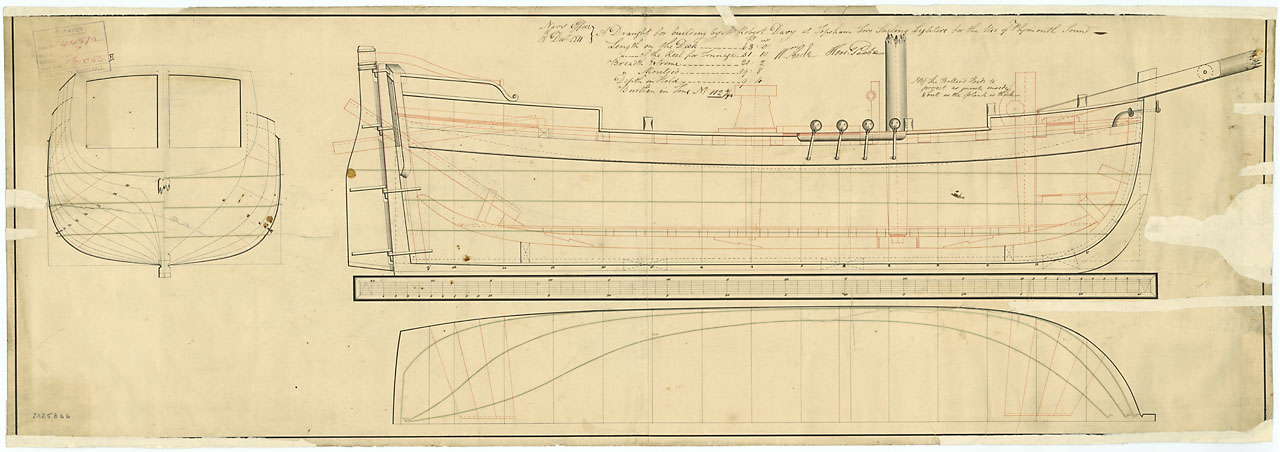 Two unnamed 63ft single-masted Sailing Lighters (1812). Scale: 1:32. Plan showing the body plan with stern board outline, sheer lines with inboard detail, and longitudinal half-breadth for building two unnamed 63ft single-masted Sailing Lighter (1812), a