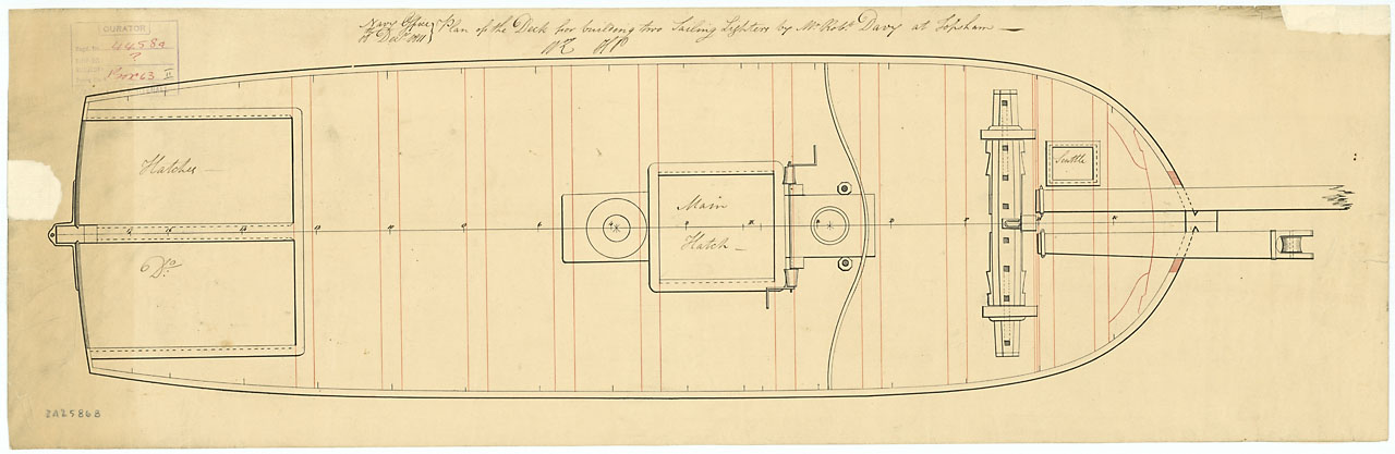 Two unnamed 63ft single-masted Sailing Lighters (1812). Scale: 1:32. Plan showing the upper deck for building two unnamed 63ft single-masted Sailing Lighter (1812), at Topsham by Mr Robert Davy for use as stone carriers in Plymouth Sound.