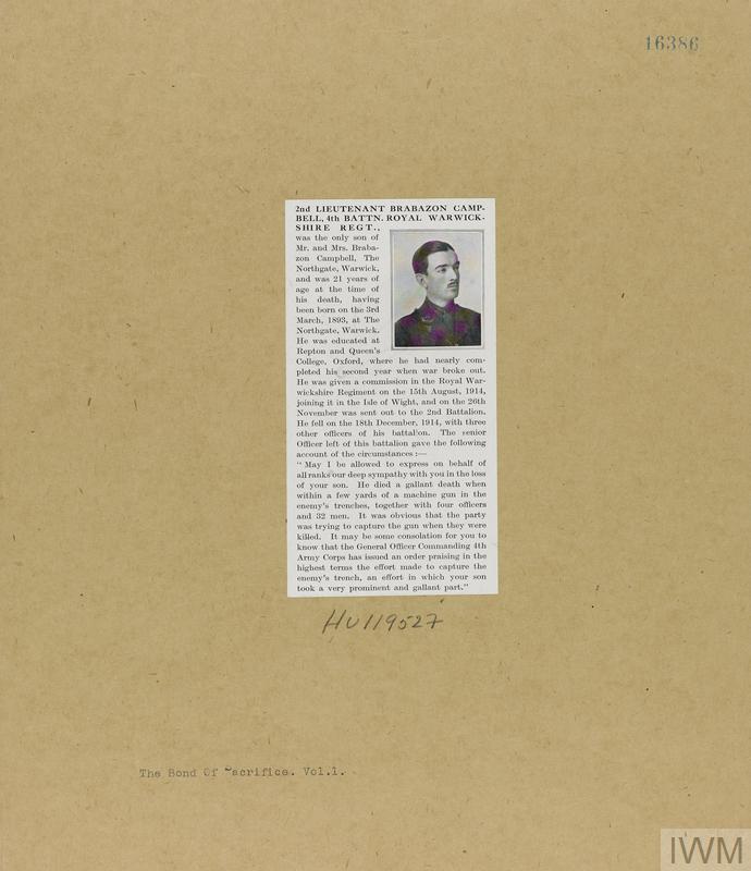 Second Lieutenant Brabazon Campbell. Unit: 4th Battalion, Royal Warwickshire Regiment. Death: 18 December 1914 Killed in action Western Front
