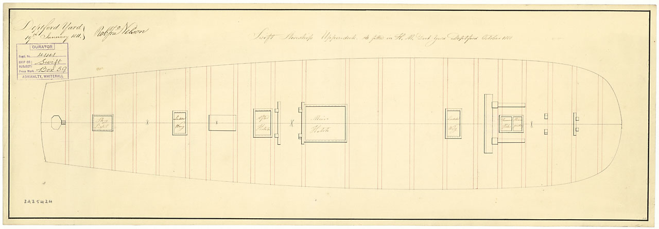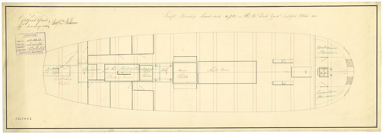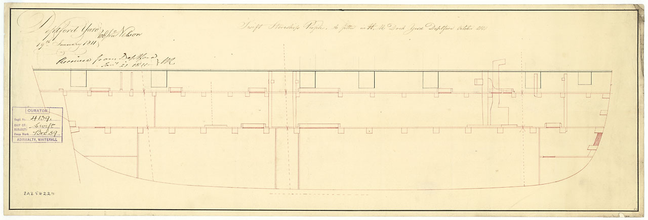Swift (purchased 1804). No scale (possibly 1:48). Plan showing an incomplete inboard profile for Swift (1804), a purchased 18-gun Sloop as fitted for a Storeship at Deptford Dockyard, October 1810.