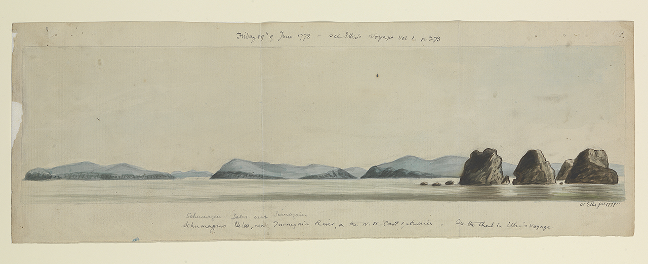 Friday 19th of June 1778 - see Ellis's Voyages Vol 1 p 278 Schumagins Isles, near Turnagain River, on the N W coast of America. See the chart in Ellis's Voyage. Medium includes graphite.; Signed by artist and dated.