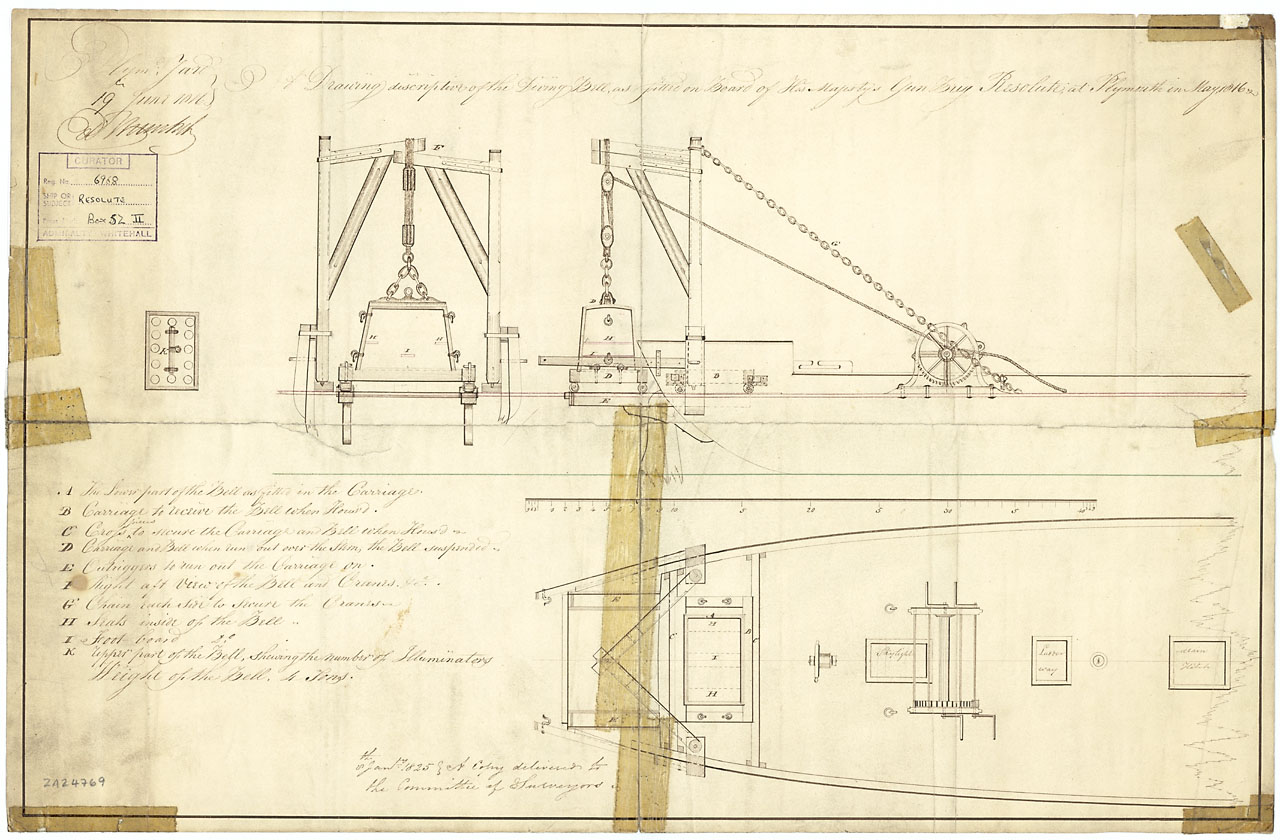 Resolute (1805). Scale: 1:48.  Plan showing the section, profile, and plan for the diving bell apparatus as fitted on the afterpart of the upper deck of Resolute (1805), a 12 gun Gunbrig.  She was fitted as a diving bell ship at Plymouth Dockyard between