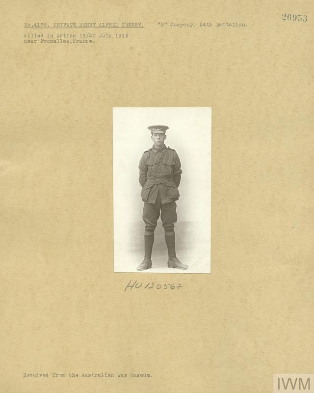 Private Henry Alfred Cressy 4179. Unit: B Company, 54th Battalion, Australian Imperial Force. Death: 19 July 1916 to 20 July 1916 Killed in action near Fromelles Western Front