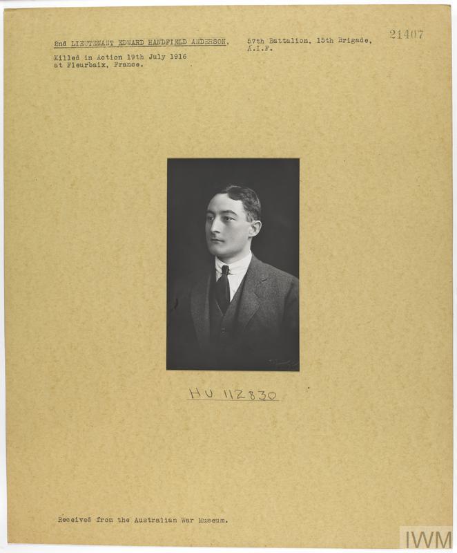 Second Lieutenant Edward Handfield Anderson. Unit: 57th Battalion, 15th Brigade, Australian Imperial Force. Death: 19 July 1916 Fleurbaix, France Western Front
