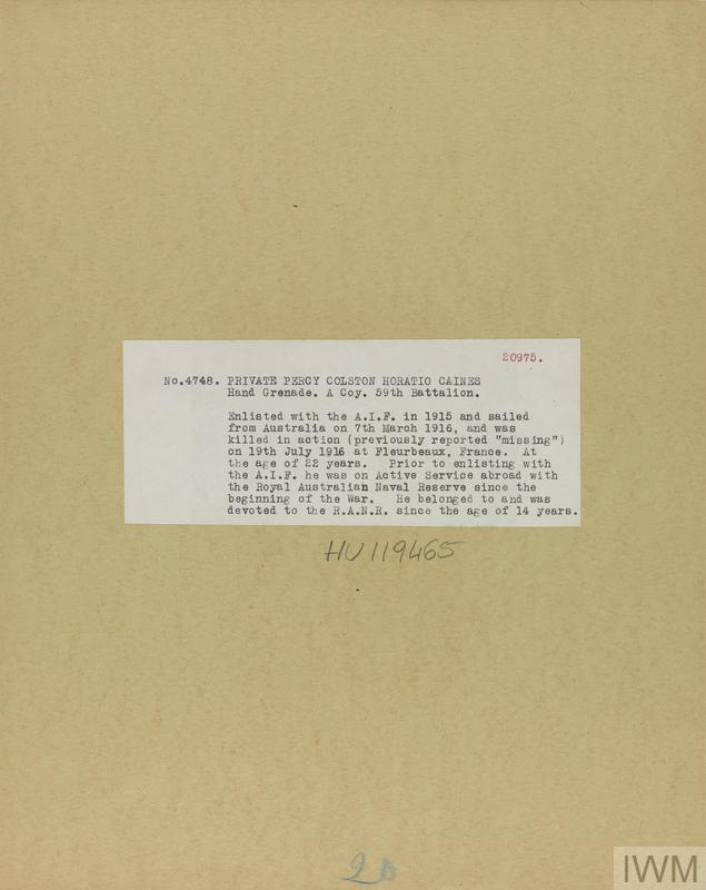 Private Percy Colston Horatio Caines 4748. Unit: A Company, 59th Battalion, Australian Imperial Force. Death: 19 July 1916 Killed in action at Fleurbeaux Western Front