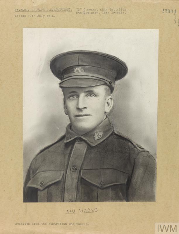 Private John Hubert Armstrong 3681. Unit: "D" Company, 60th Battalion, 15th Brigade, 5th Division, Australian Imperial Force. Death: 19 July 1916, Western Front.