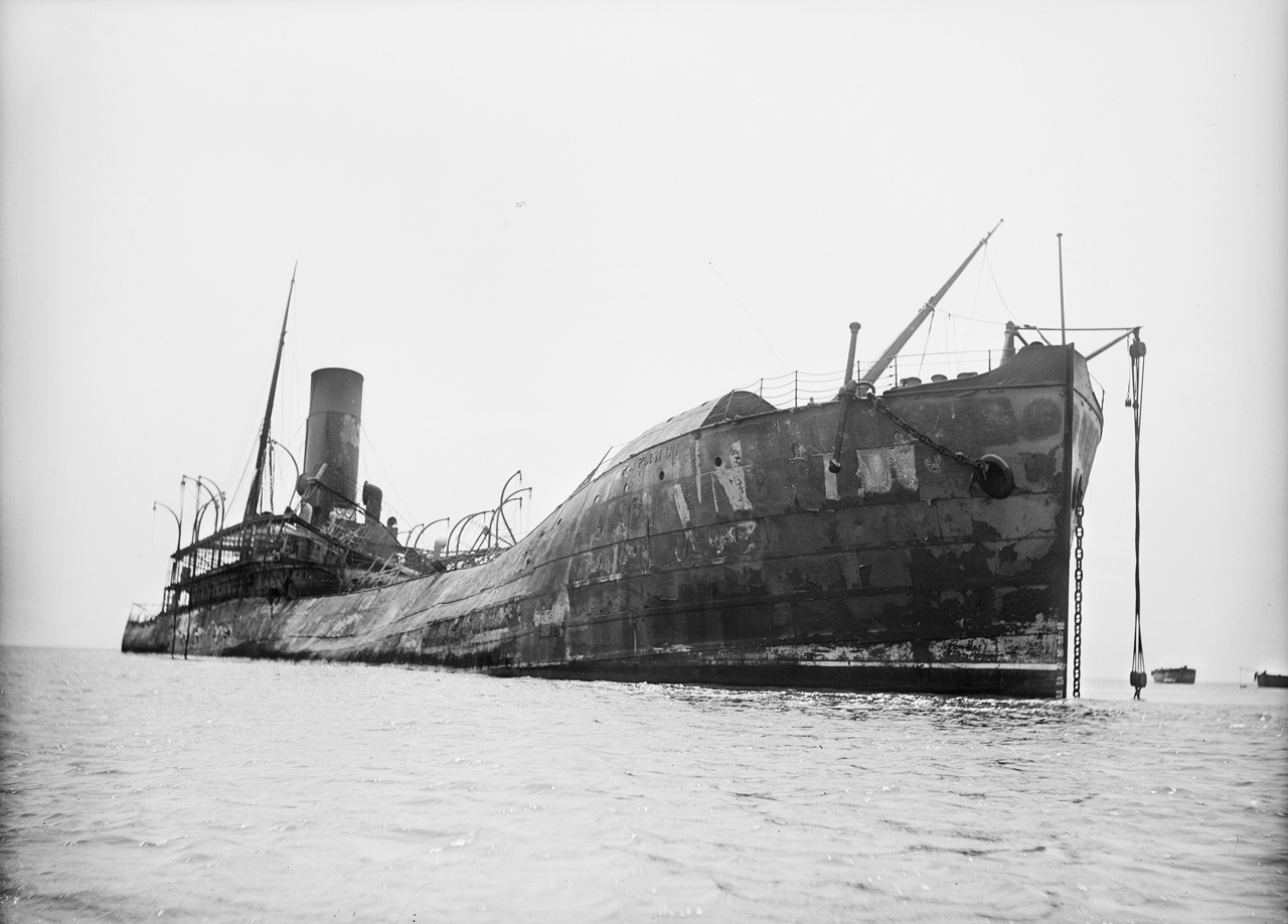 Papanui (1898) abandoned as a burnt out wreck off St Helena.. A port bow view of the passenger/cargo ship Papanui (1898) at anchor after the fire had been put out and the ship abandoned as a wreck. The starboard side between the bridge and forecastle has