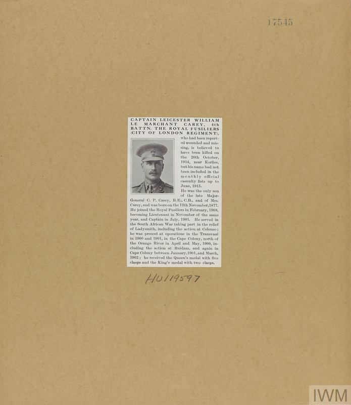 Captain Leicester William Le Marchant Carey. Unit: 4th Battalion, Royal Fusiliers (City of London Regiment). Death: 19 October 1914 Missing believed killed in action near Kerlies Western Front