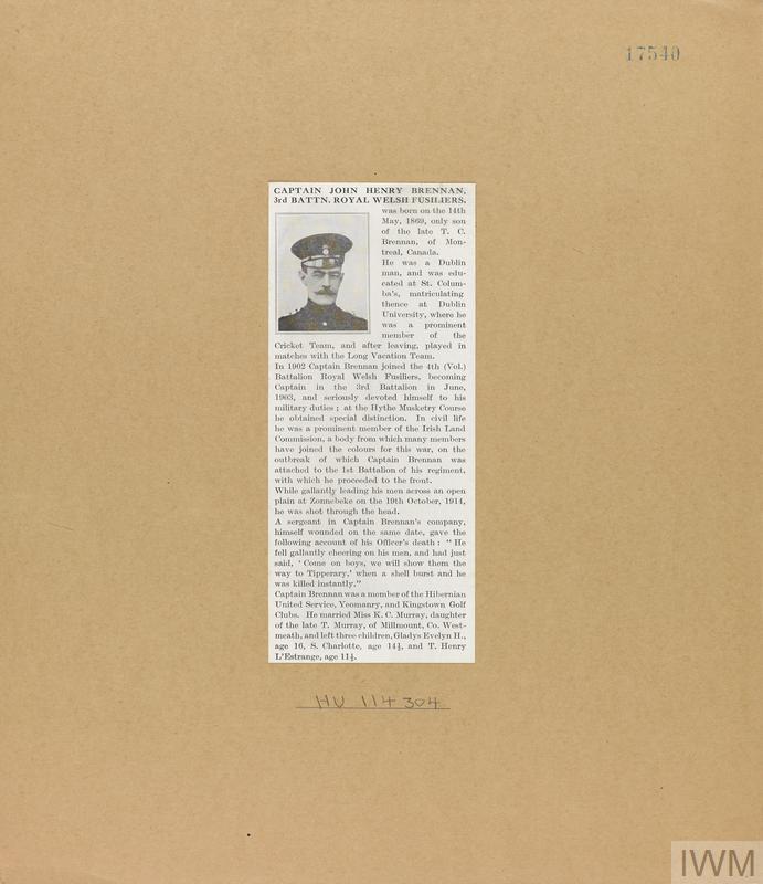 Captain John Henry Brennan. Unit: 3rd Battalion, attached to 1st Battalion, Royal Welsh Fusiliers. Death: 19 October 1914 Zonnebeke Western Front