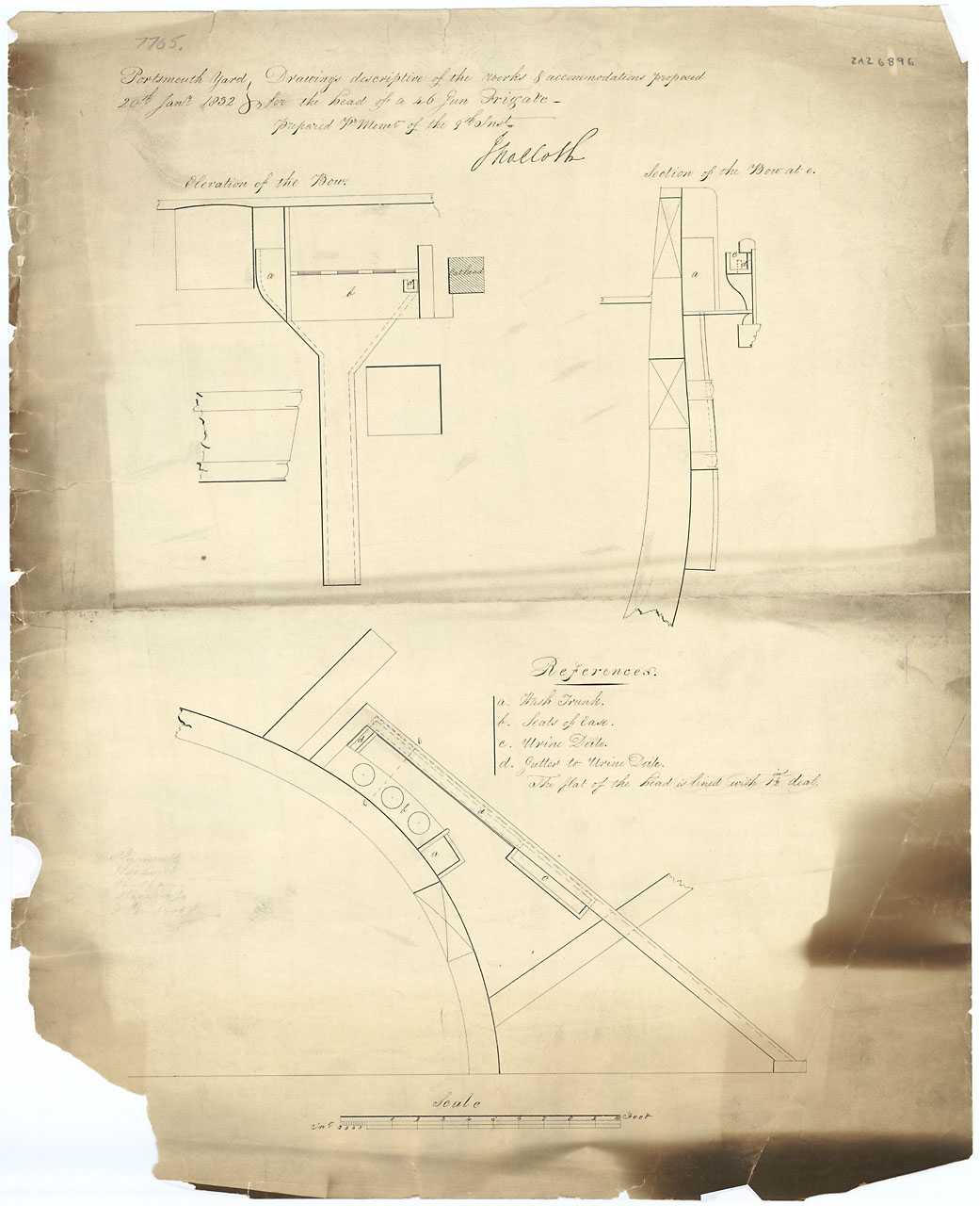Proposed heads and urinals for the bow of a 46 gun Frigate. Scale: 1:24. Plan showing an elevation, plan, and section of part of the port bow for a 46 gun Fouth Rate Frigate, illustrating the configuration of the heads, urinals and wash trunk, as propose