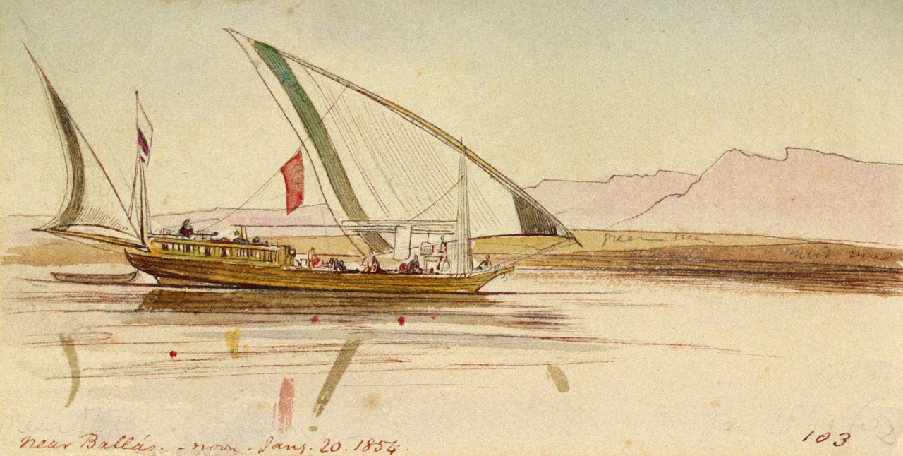 'Near Ballas. noon. Jany. 20.1854.' (103). This study of a gyassi on the Nile near Ballas was taken on Edward Lear’s second journey to Egypt in 1854. The lateen-rigged traditional cargo vessel is portrayed on calm water with a stretch of b