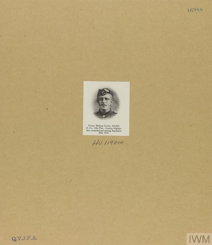Private William Catto 241294. Unit: 14th Platoon, "D" Company, 4th Battalion, Gordon Highlanders. Death: 20 September 1917, missing in action, Western Front. Commemorated on the Tyne Cot Memorial.