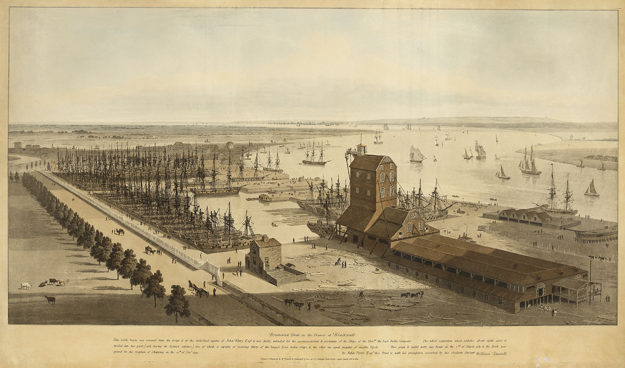 Brunswick Dock on the Thames at Blackwall. Print entitled 'Brunswick Dock on the Thames at Blackwall... chiefly intended for the accommodation & protection of ships of the Honble the East India Company...'. The print was drawn, engraved and