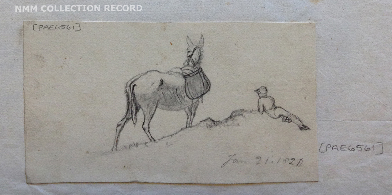 Sketch of a donkey with panier and a reclining figure. Mounted with PAE6560.