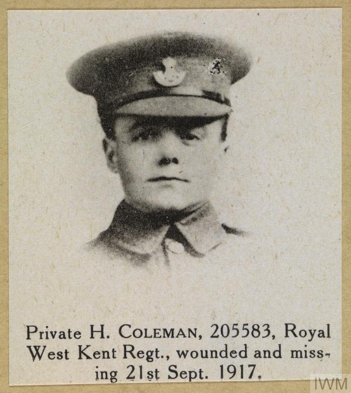 Private Henry Coleman 205583. Unit: 10th Battalion, Royal West Kent Regiment. Death: 21 September 1917 Wounded and Missing in action Western Front