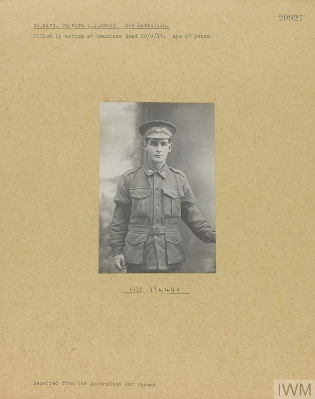 Private Charles James Gordon Bruce 6472. Unit: 3rd Battalion, Australian Infantry, Australian Imperial Force. Death: 21 September 1917 Mennines Road Western Front