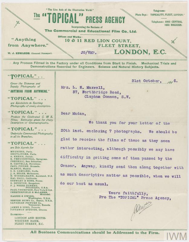 CORRESPONDENCE RELATING TO THE PHOTOGRAPHS OF LT H W L PRESTON, 1916