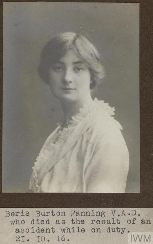 Miss Beris Burton Fanning, Voluntary Aid Detachments. Died as the result of an accident on duty 21 October 1916.