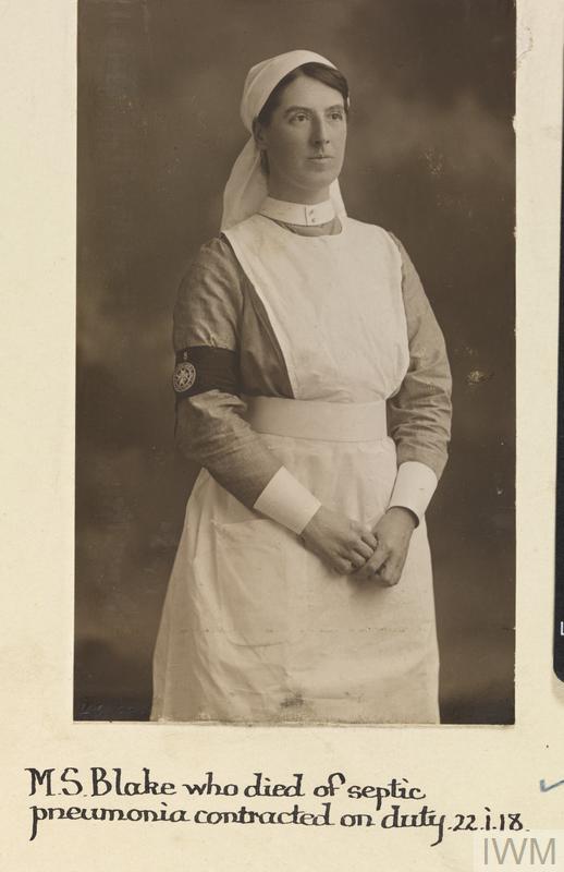 Miss M S Blake, Voluntary Aid Detachments. Died of septic pneumonia contracted on duty 22 January 1918.