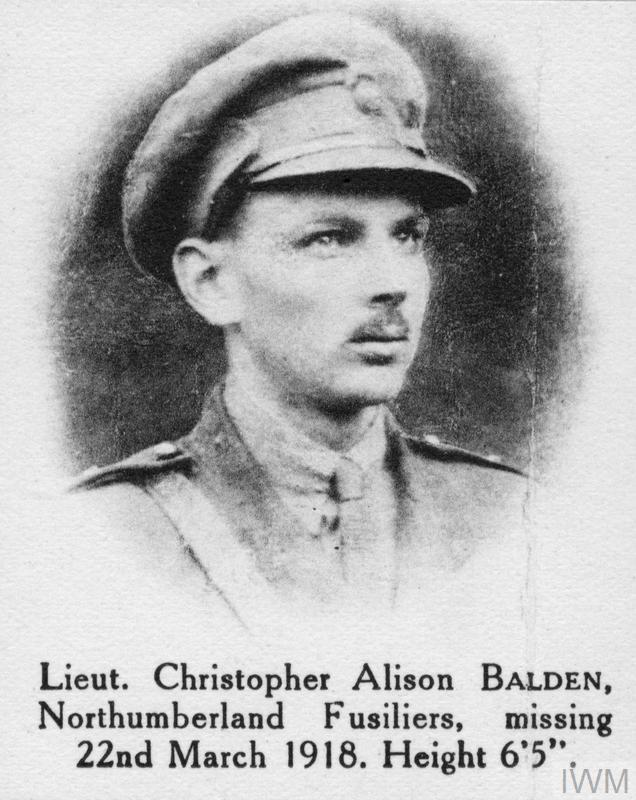 Lieutenant Christopher Alison Balden. Unit: Northumberland Fusiliers. Death: 22 March 1918
