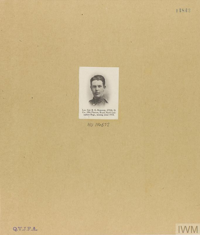 Lance Corporal Bertram George Burgess 27926. Unit: 10th Platoon, D Company, 9th Battalion, Loyal North Lancashire Regiment. Death: 22 March 1918 Western Front