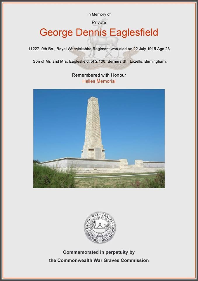 Private George Dennis Eaglesfield 11227, Royal Warwickshire Regiment