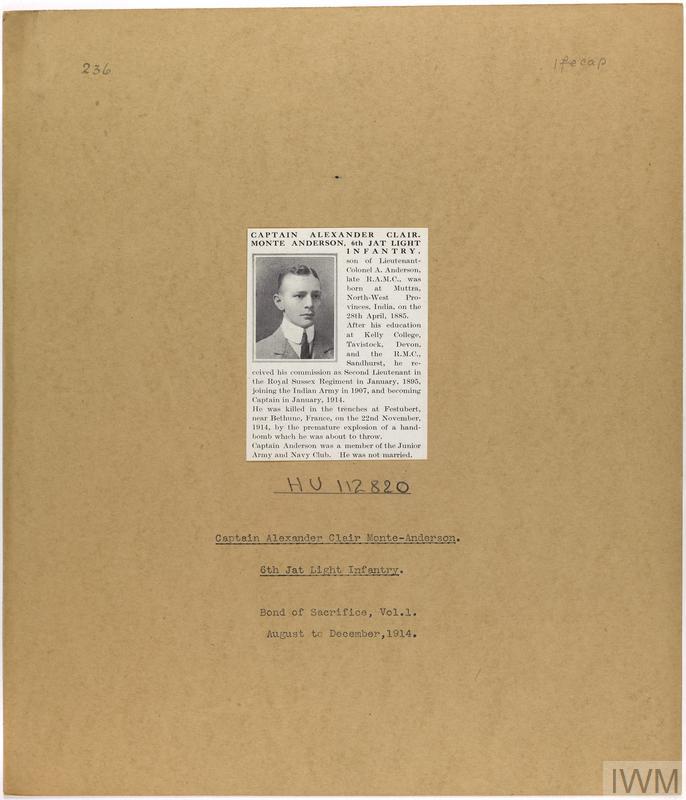 Captain Alexander Clairmonte Anderson. Unit: 6th Jat Light Infantry, Indian Army. Death: 22 November 1914 Festubert near Beune, France Western Front