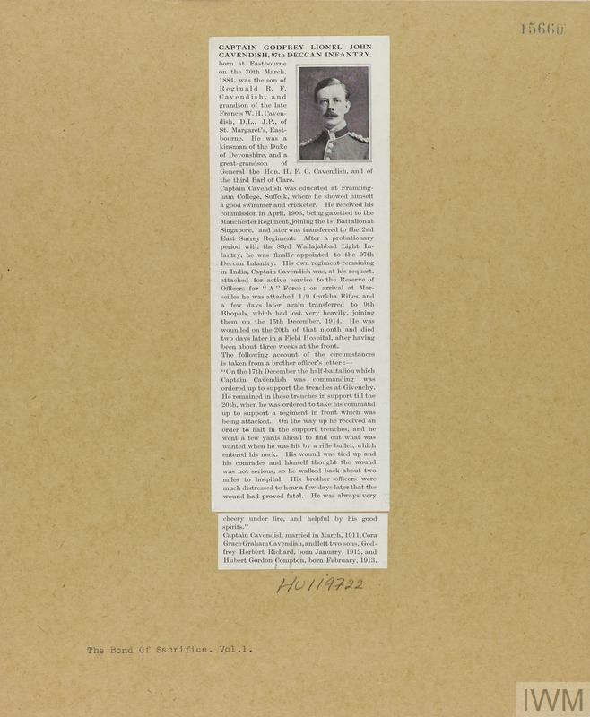 Captain Godfrey Lionel John Cavendish. Unit: 97th Deccan Infantry, attached to 1st Battalion, 9th Bhopal Infantry, Indian Army. Death: 22 December 1914 Killed in action Age 31 Western Front
