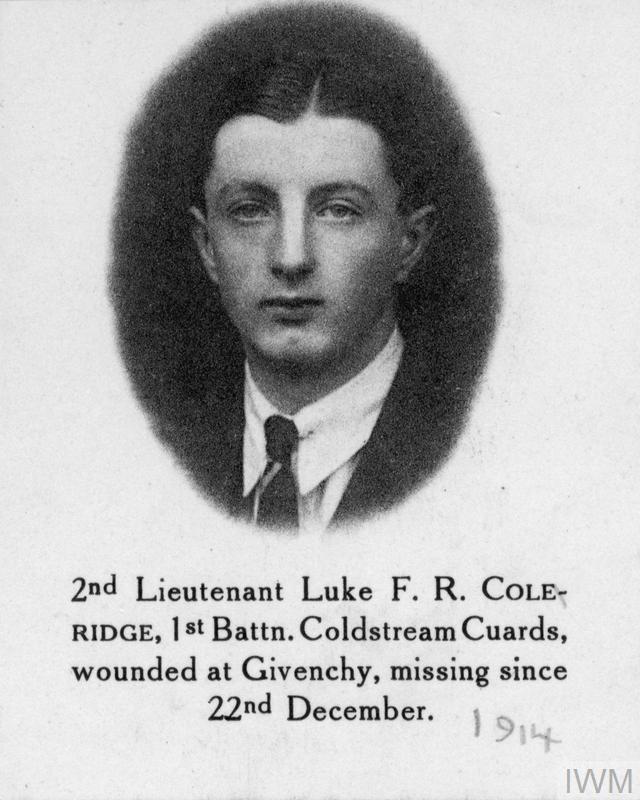 Second Lieutenant Luke Frederick Rennell Coleridge. Unit: 1st Battalion, Coldstream Guards. Death: 22 December 1914 Wounded and Missing in action at Givenchy Western Front.