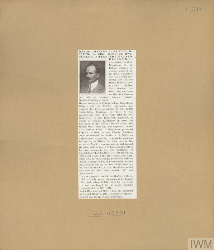 Major Charles Bliss CIE. Unit: 1st Battalion, 1st King George's Own Gurkha Rifles (The Malaun Regiment). Death: 22 December 1914 Of wounds Lillers Western Front. Son of Sir Henry W. Bliss, K.C.I.E.